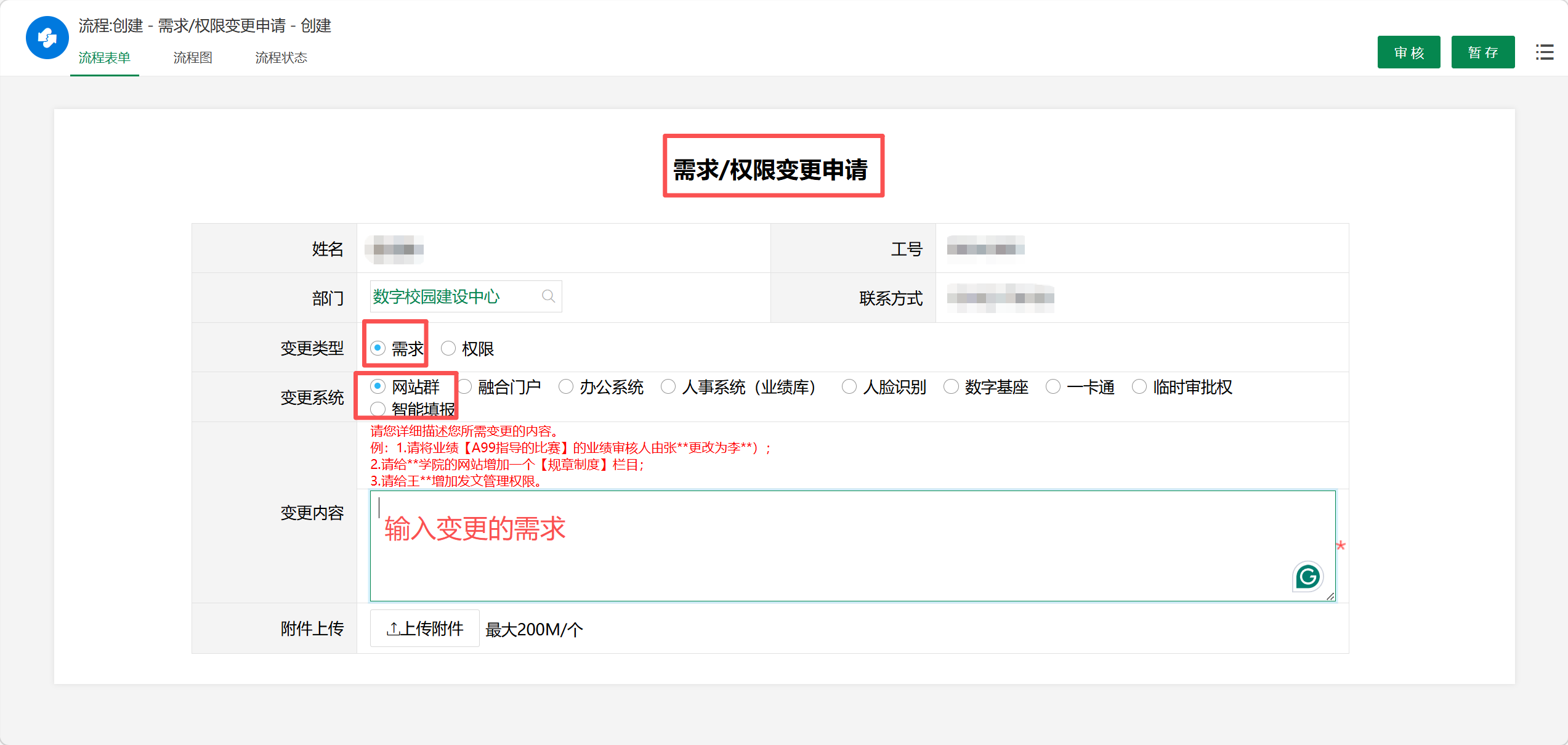 根据需要,选择需求变更或权限变更,更改栏目等需求,请选择需求变更,选择网站群,输入变更内容,详细需求文档可以以附件形式补充。